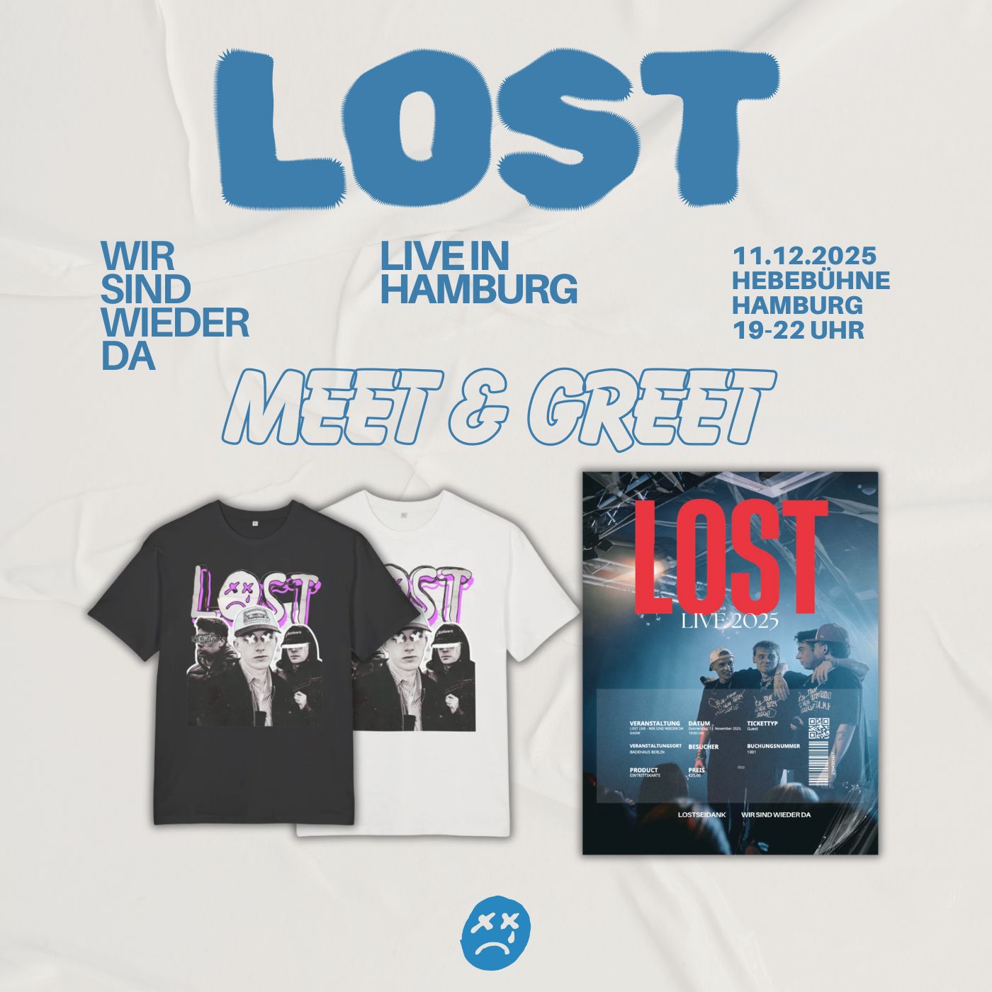 Mit dem Meet & Greet Ticket kommst 1 Stunde vor allen anderen in den Club. (18 Uhr). Das T-Shirt erhältst du von LOST vor Ort, dort kannst du dich in Ruhe für die Größe / Farbe entscheiden.